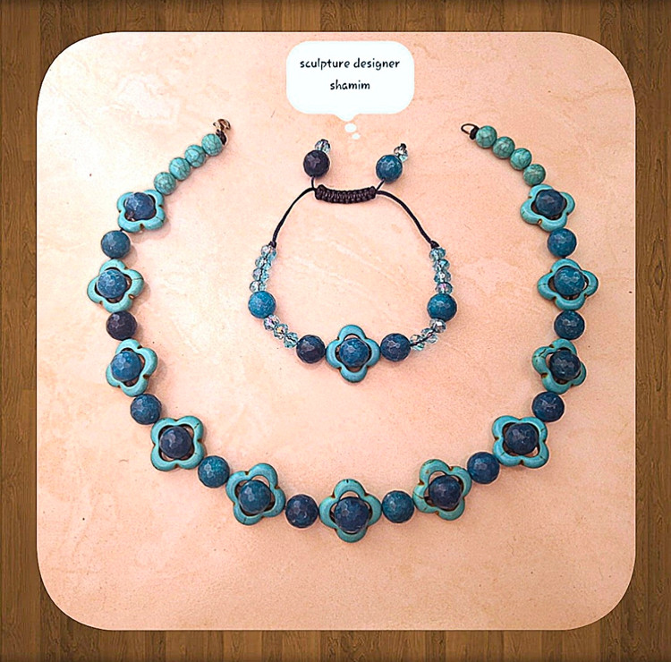 اکسسوری شمیم با بکارگیری از بهترین سنگ مدل آپاتیت آبی، فیروزه و کریستال و نخ موم شده و خلاقیت در طراحی و نوع بافت نخ موم شده، طرحی خاص و منحصر به فرد را به گردنبند و دستبند داده است.
